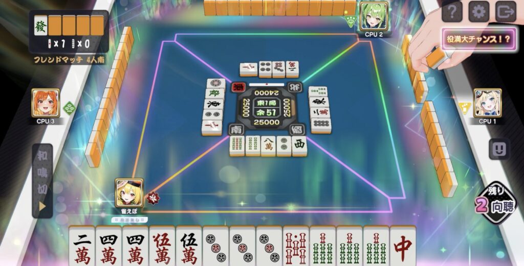 次に、異能力スキルのあるエンタメモードに移ると、「普通の麻雀+α」の感覚で楽しめ、違和感が少ないです。